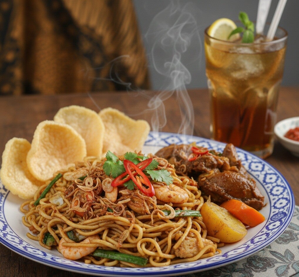 De 'Crunch' Factor: Geen maaltijd is compleet zonder de goudbruine gebakken uitjes en een flinke zak krakende kroepoek.